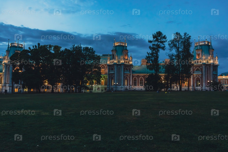 Широкий вид на освещенный готический дворец в сумерках