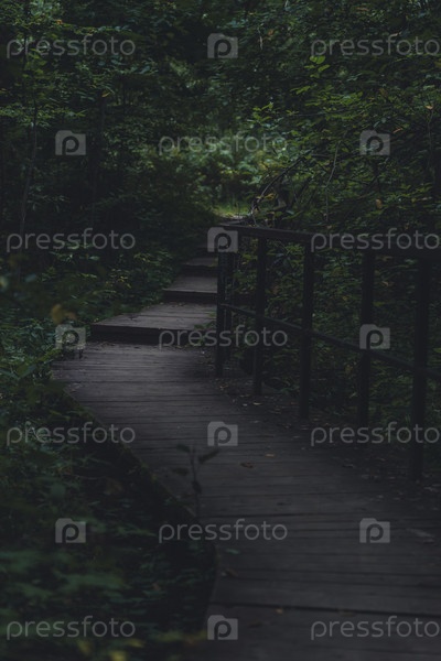 Деревянная набережная через пышный, тенистый лес