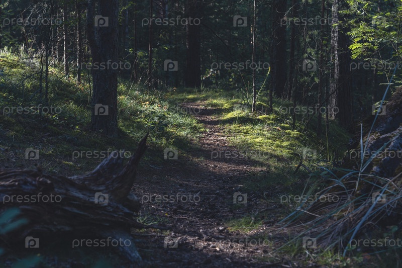 Солнечный лес с высокими соснами и затененной землей