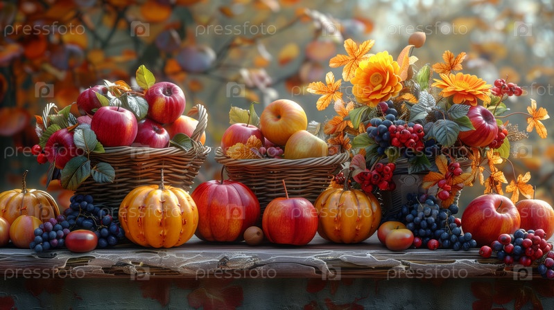 Осенние корзины с яблоками и тыквами