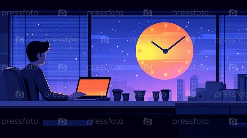 Офисный работник смотрит на ночное небо и большие часы через окно