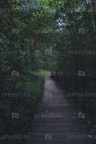 Деревянная набережная через пышный, тенистый лес