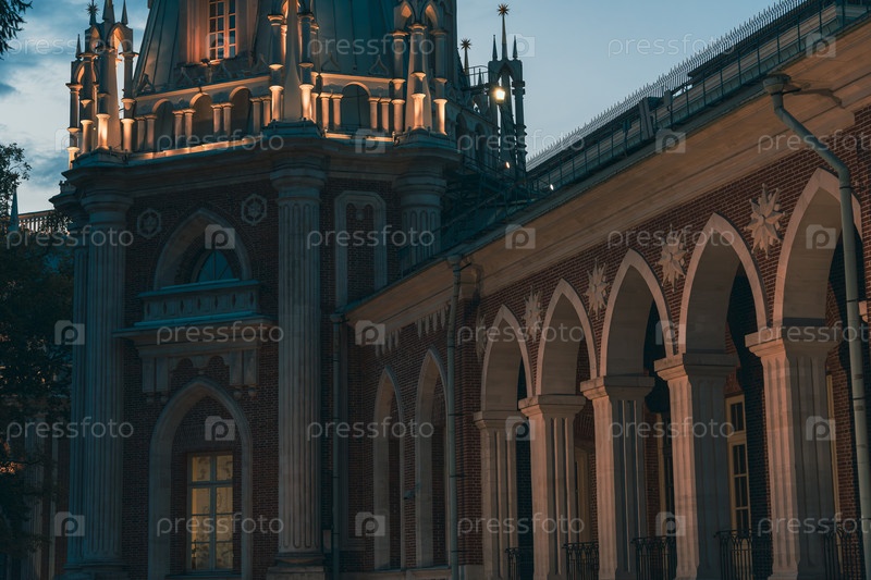 Подробный вид на готические арки и освещенную башню