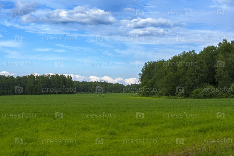 Зеленый луг с лесом и голубым небом