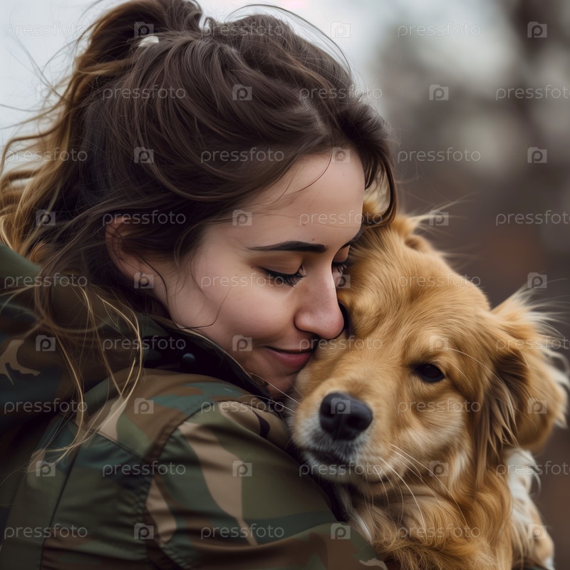 Женщина обнимает свою собаку на улице