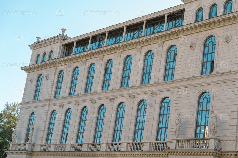 Фасад исторического здания с рядом арочных окон и статуй