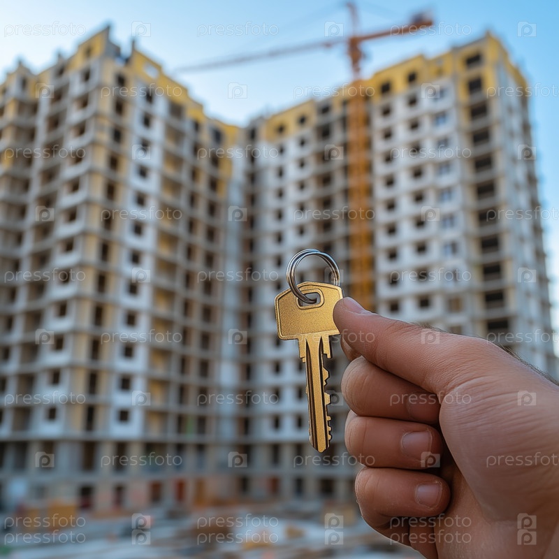 Рука, держащая ключ перед новыми многоквартирными домами