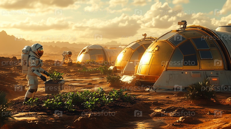 Астронавт занимается сельским хозяйством на Марсе возле куполов футуристической среды обитания