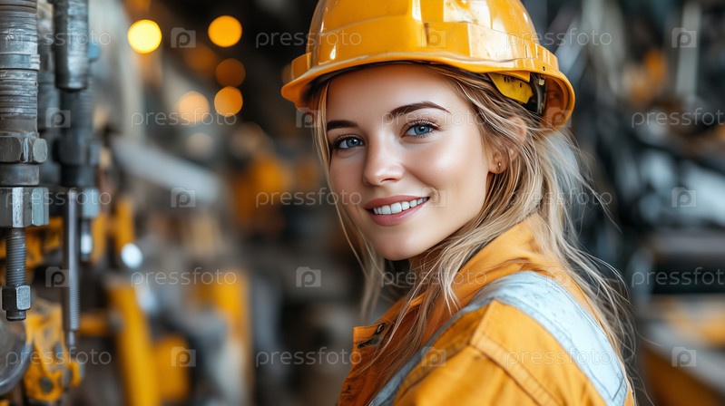 Улыбающаяся женщина-инженер в защитном снаряжении на промышленной площадке