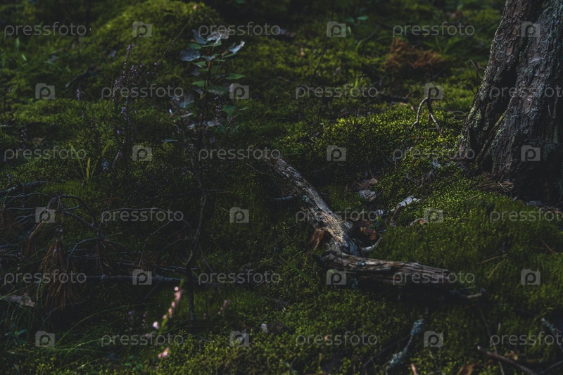 Темный лесный пол с мхом, ветвями и стволом