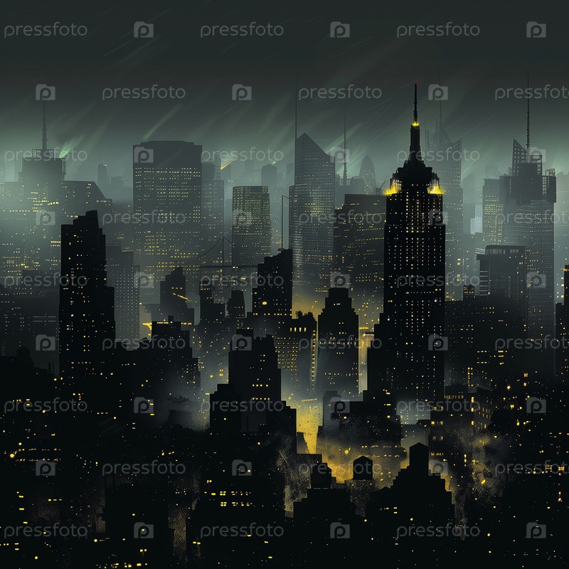 Город полуночи с одной башней с желтым светом