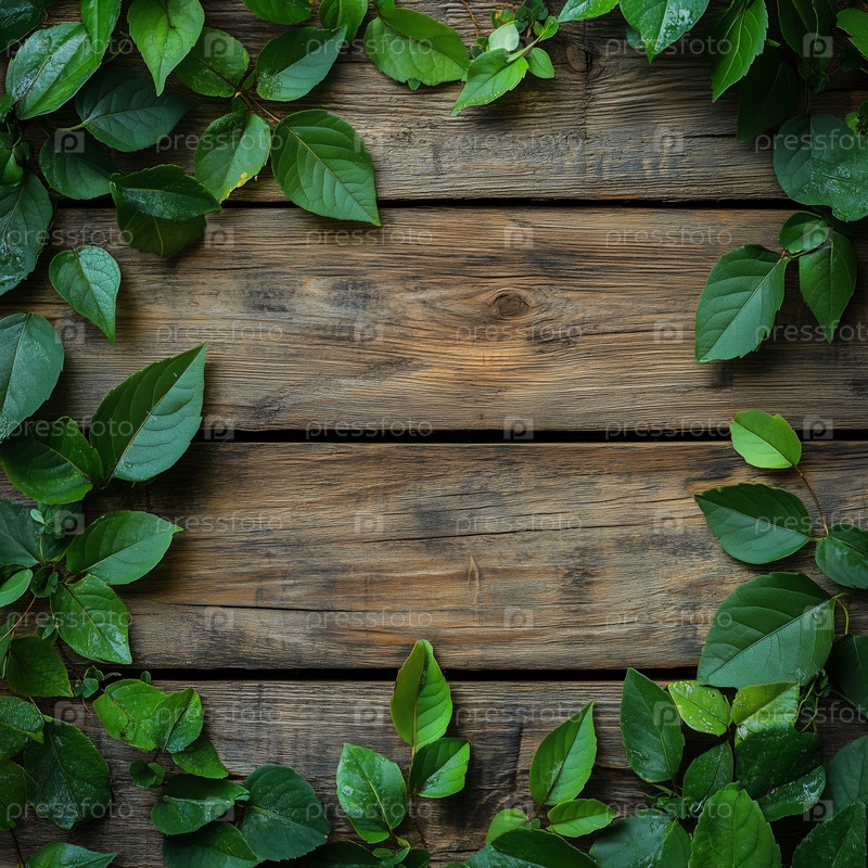 Зеленые листья расположены на деревянной поверхности