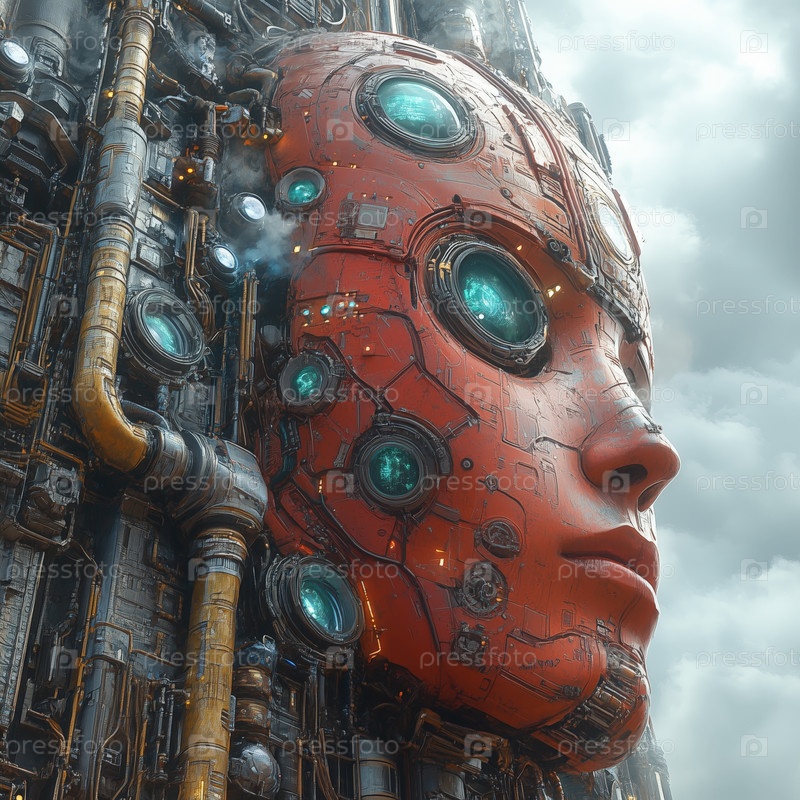 Гигантское футуристическое механическое лицо с встроенной технологией