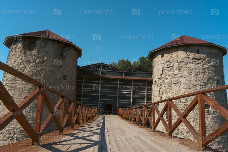 Вход в историческую крепость с каменными башнями-близнецами и деревянным мостом