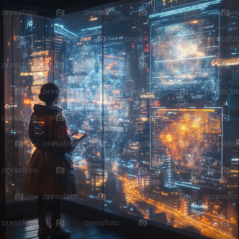 Футуристическая городская улица с цифровыми экранами и неоновыми огнями