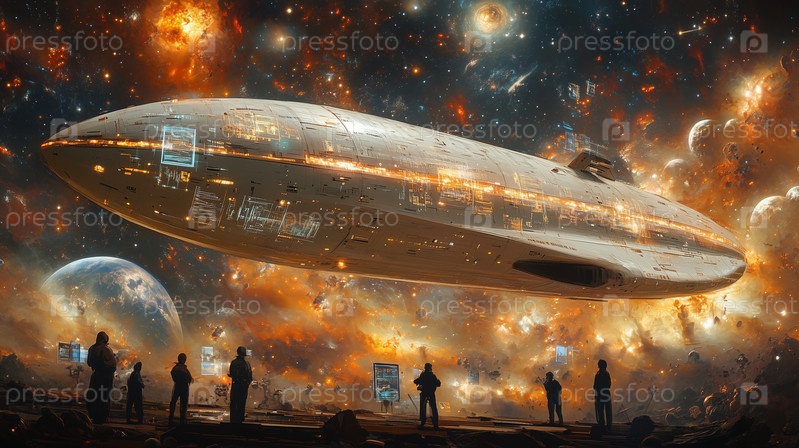 Массивный космический корабль парит над инопланетным пейзажем в глубоком космосе