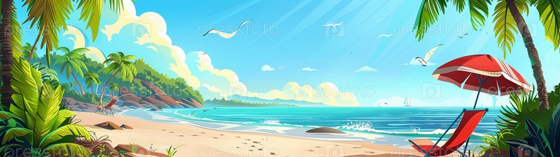 Широкий фон с летним иллюстрированным искусством о играх на пляже и расслаблении