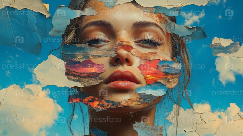 Сюрреалистический женский портрет, объединенный с текстурами неба и океана заката
