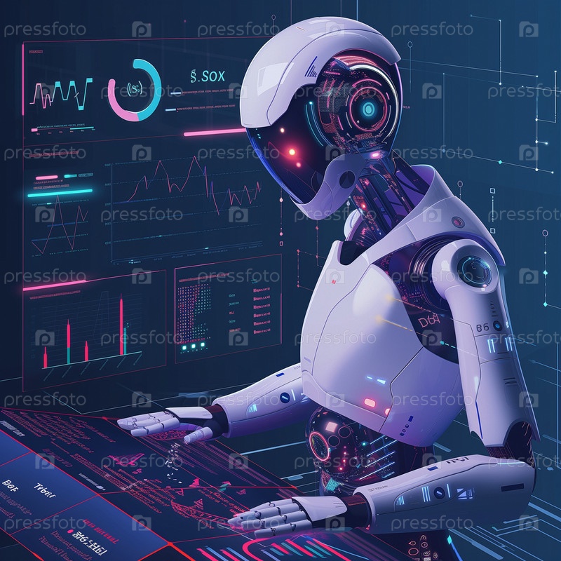 Белый робот анализирует данные на цифровом сенсорном экране