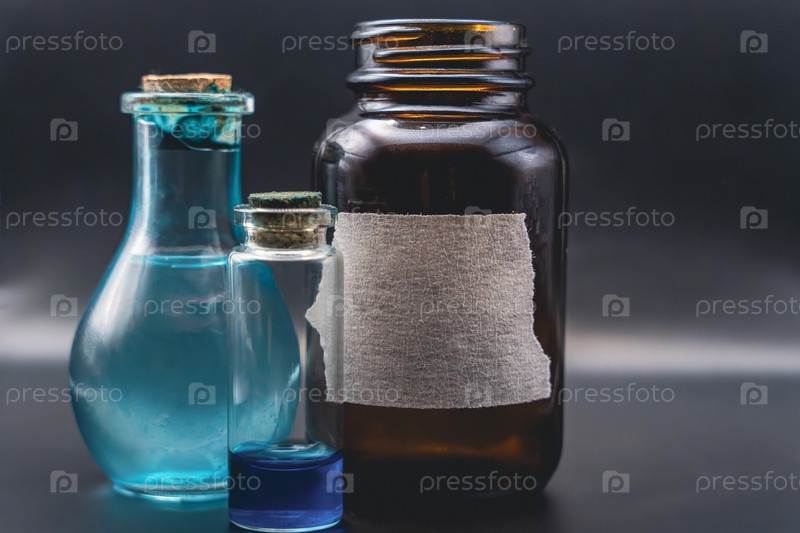 Ассортимент стеклянных бутылок с синей жидкостью и разорванной этикеткой на темном фоне
