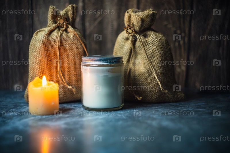 Субъект фотографии - пакеты и контейнерная банка при свете свечи