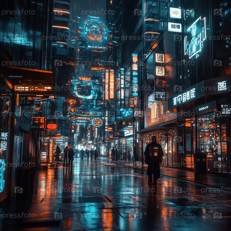 Футуристическая городская улица ночью с неоновыми огнями и цифровыми рекламными щитами