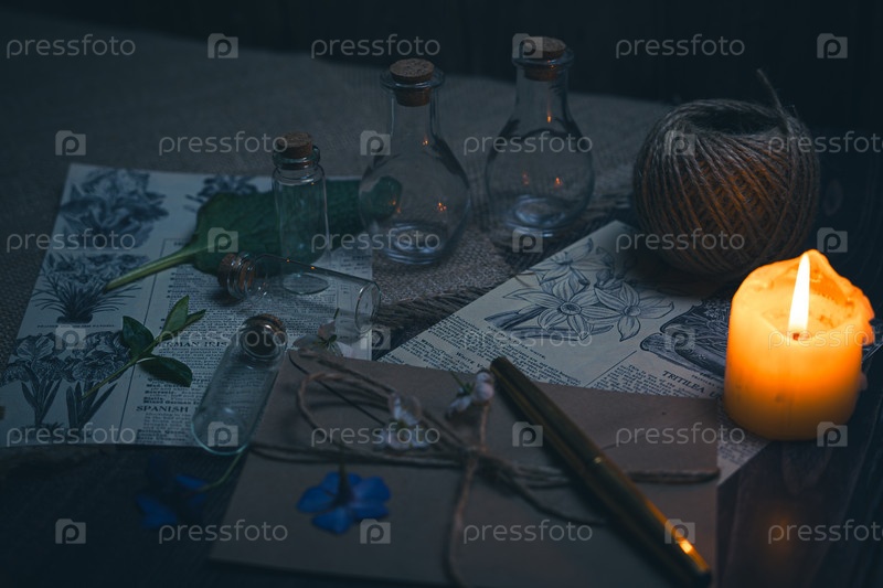 Мистический натюрморт в винтажном стиле с пустыми флаконами, горящими свечами, письмами и вырезками из газет