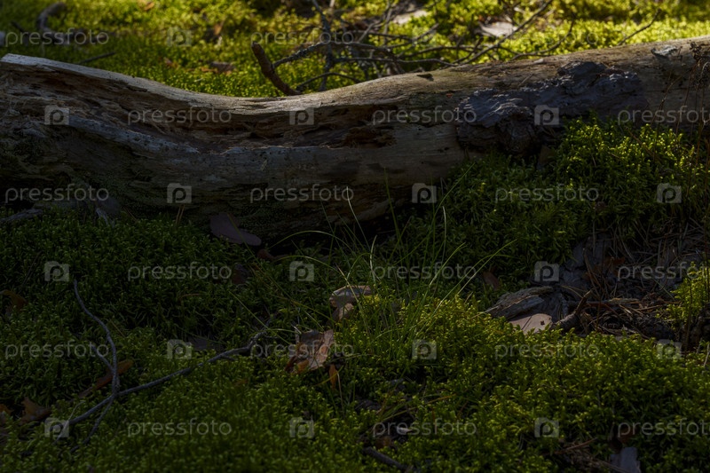 Павший ствол дерева на покрытом мхом лесополосе в солнечном свете