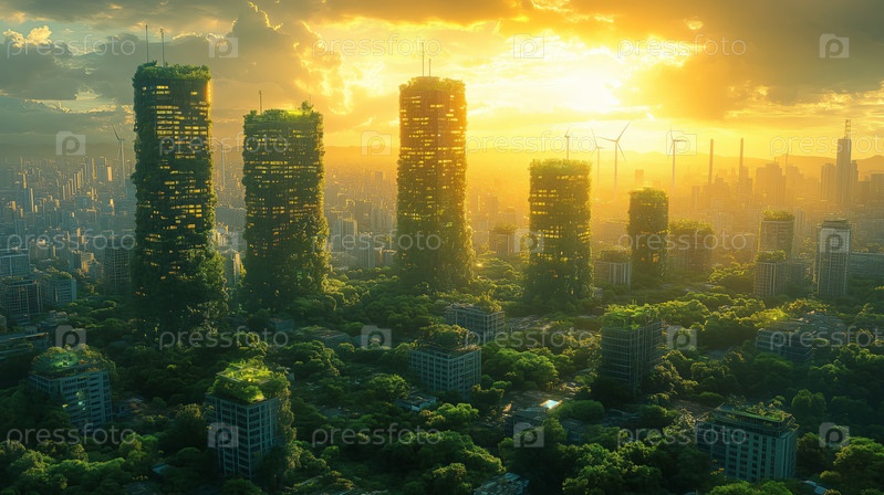 Футуристический экогород с зелеными небоскребами на закате