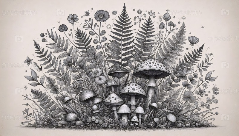 Ботаническая иллюстрация лесного ландшафта, Ai generated image