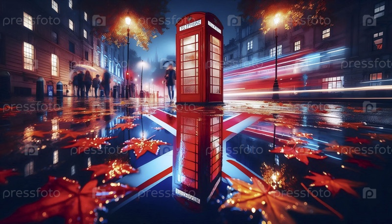 Флаг Союза в Лондоне отражается на дождливой тротуаре, Ai generated image