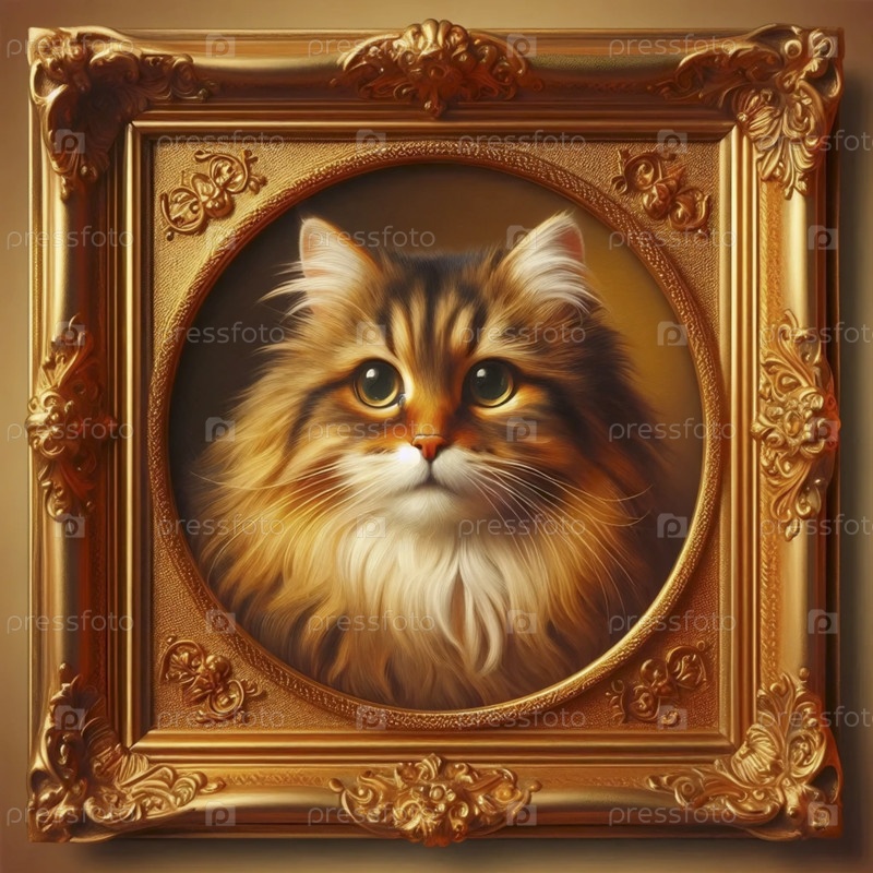 Небольшой портрет кота с золотой рамкой, масляная живопись, Ai generated image
