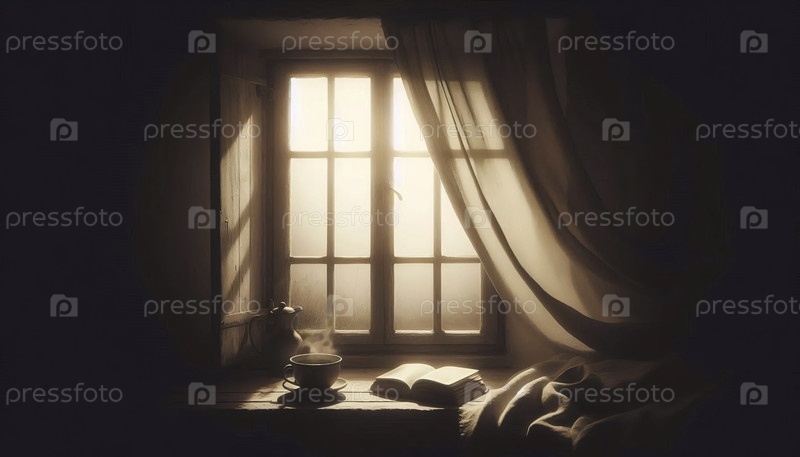 Пустое окно с чашкой кофе на рассвете, Ai generated image