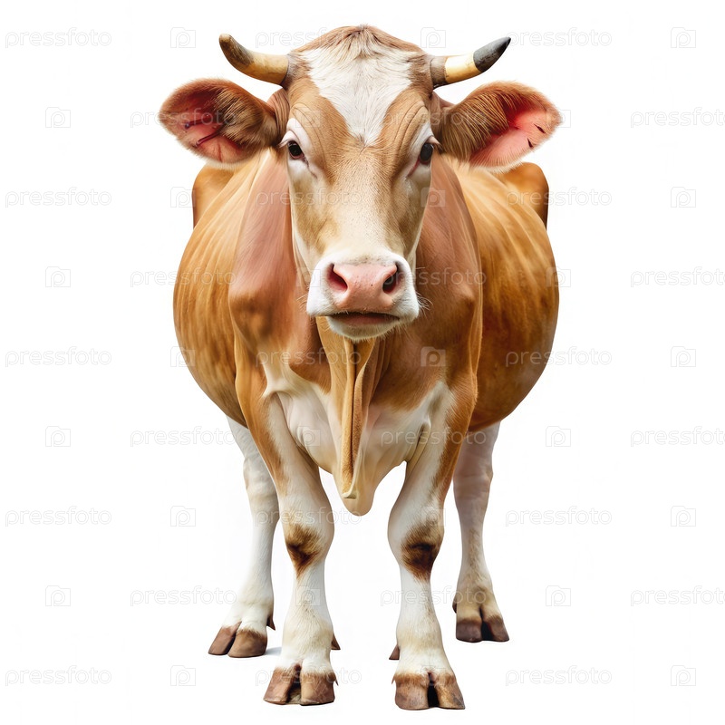 Коричневая и белая коровы, стоящие на белом фоне