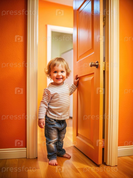 Веселый ребенок стоит у двери с оранжевой стеной позади