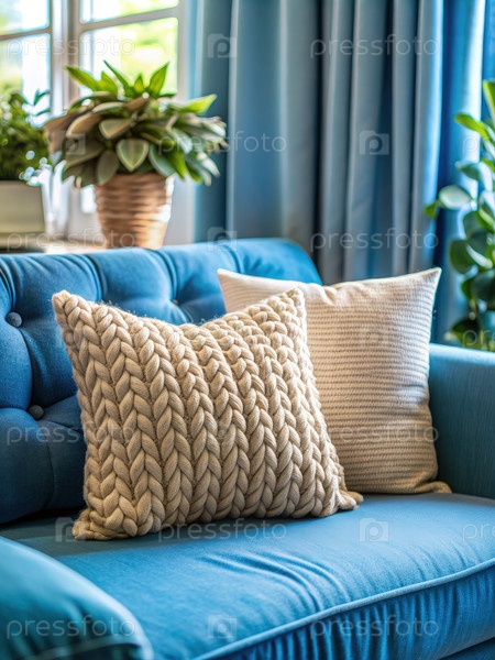 Бежевая вязаная подушка на синем диване в уютной гостиной. генеративный ИИ