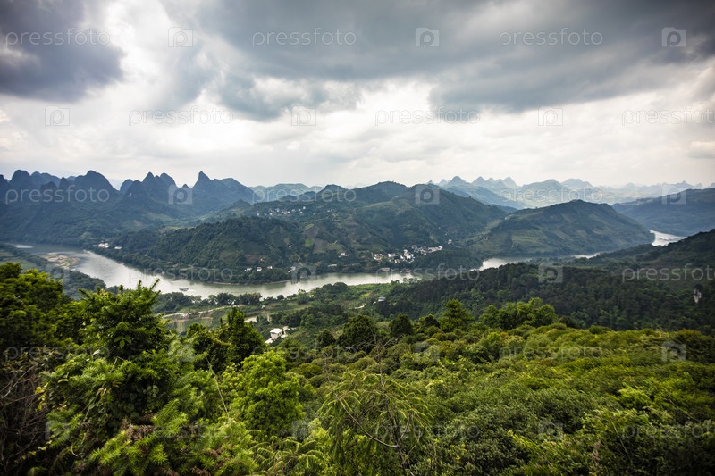 Карстовые горы и извилистая река Ли под грозовыми облаками, Гуйлинь