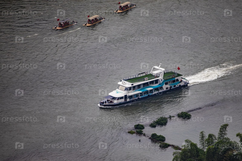 Пассажирский теплоход и лодки на реке Ли в Гуйлине, вид сверху