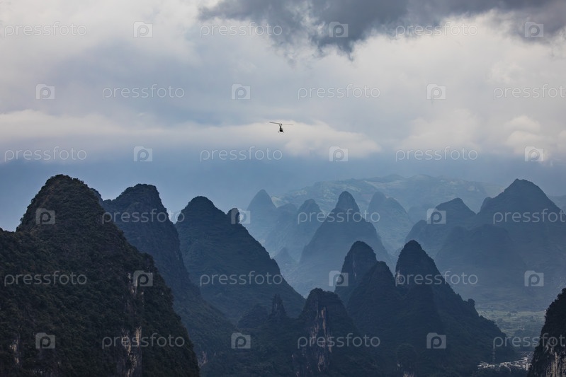 Карстовые горы Гуйлиня под драматичным небом и вертолетом