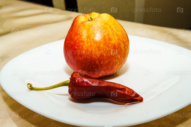 Натюрморт. Яблоко и перец на белой тарелке