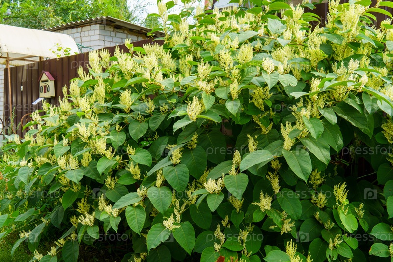 Городской пейзаж. Частный сектор. Рейнутрия сахалинская, также известная как горец сахалинский или сахалинская гречиха. Воронеж