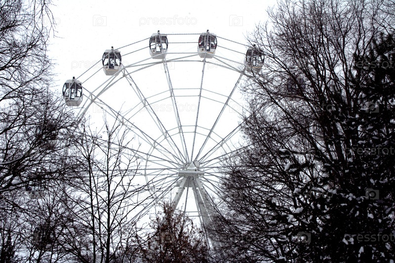 Большое белое колесо обозрения среди заснеженных деревьев