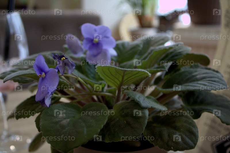 Фиолетовая фиалка в горшке на столе в комнате