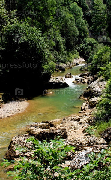 Река Гуамка течет среди камней и валунов в глубоком Гуамском ущелье Апшеронского района в солнечную погоду