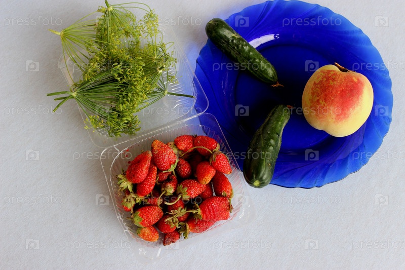 Натюрморт из свежих овощей, зелени, фруктов и ягод: укроп, огурцы, песик, ягоды клубники