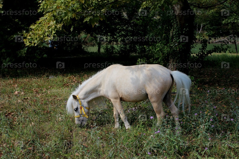 Лошадка белой масти спокойно пасется на деревенском лугу в солнечный день
