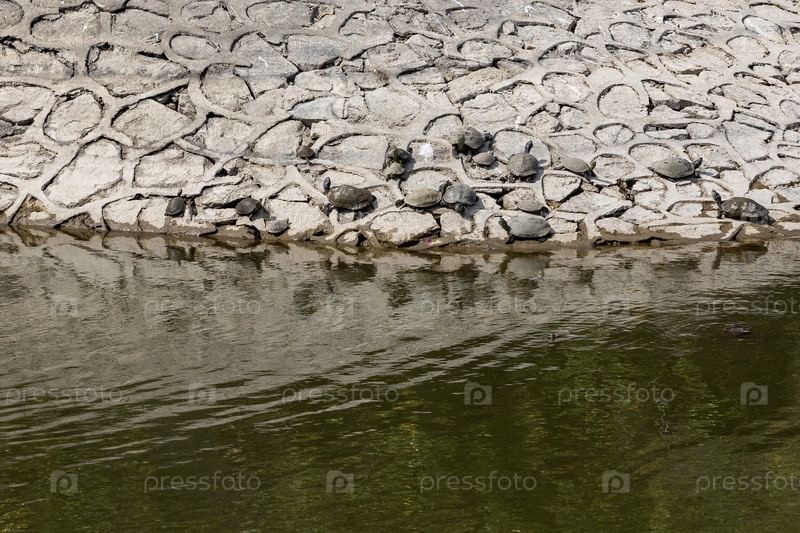Китай.Саня.Красноухие черепахи греются на камнях.Китай.Саня.Красноуховые черепахи, басующиеся на камне