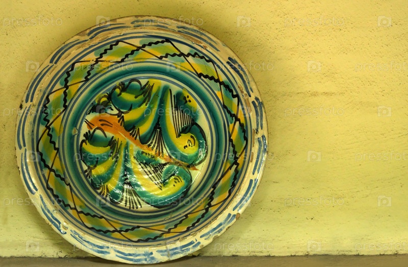Старая ручная керамическая плита на фоне желтой стены.Изолированный натюрморт для создания фона