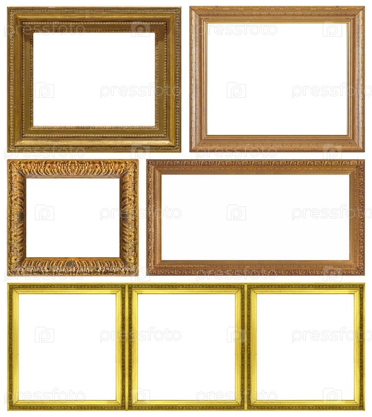 Набор золотых рамок для картин, зеркал или фотографий, изолированных на белом фоне