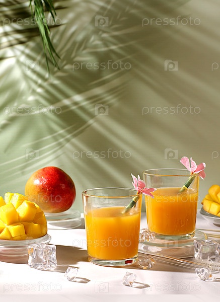 Холодный домашний смузи, сок или лимонад с кусочками манго, льдом и фруктами. освежающий рецепт летнего напитка. детоксикационная диета и концепция похудения. меню ресторана. баннер вечеринки в доме. Бланк бара и кафе